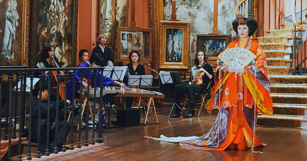 Moment phare de la soirée : la cérémonie d’habillage d’un jūninīhitoe, vêtement traditionnel porté à la cour impériale japonaise. Ce processus complexe, composé de multiples couches, a captivé l’assistance par sa grâce et son symbolisme. Les gestes précis et rituels des habilleuses ont été une véritable immersion dans l’histoire impériale du Japon.