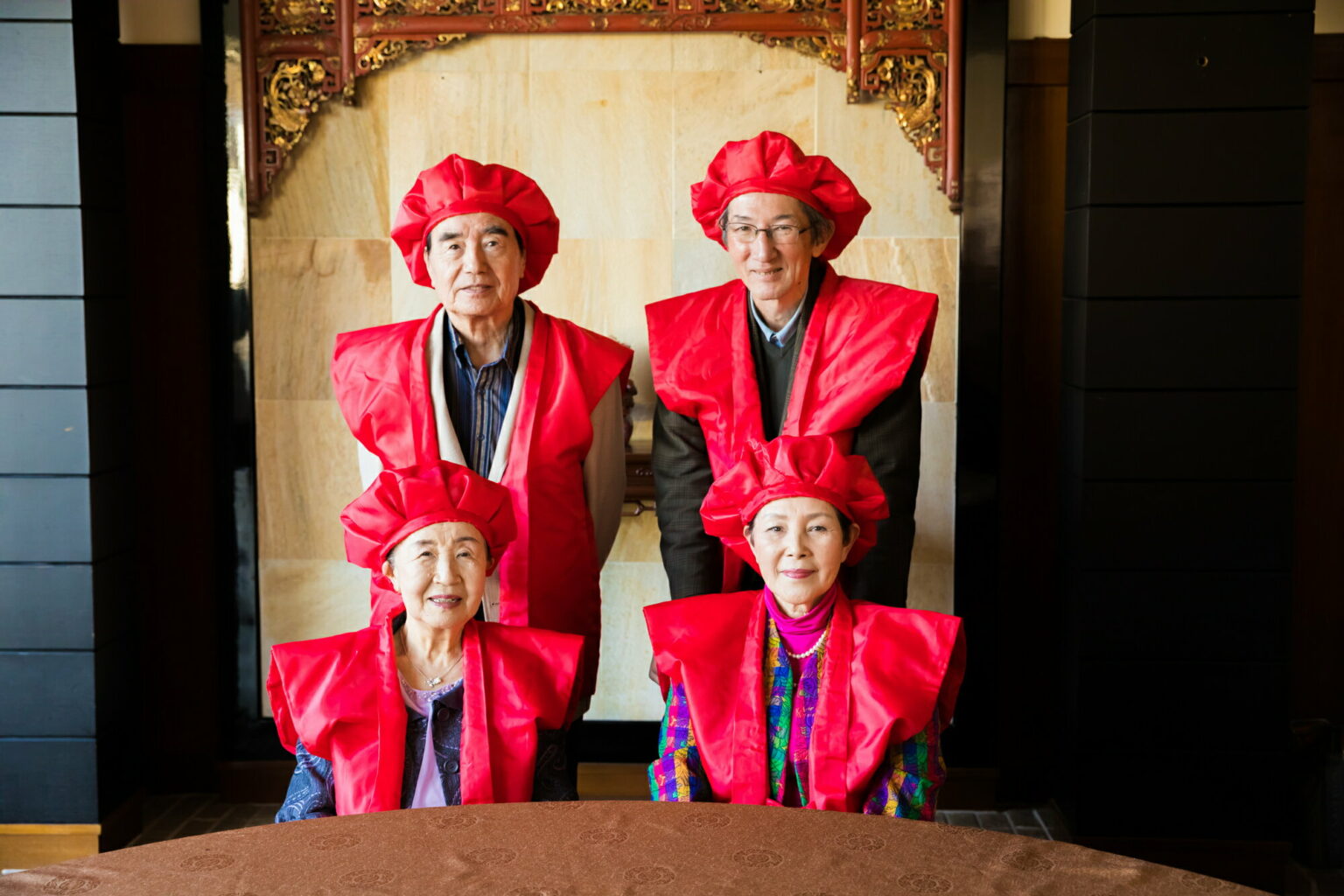 Gilets traditionnels écarlates posés sur les épaules, charlottes rouges coiffant des visages vieillissants illuminés de larges sourires…