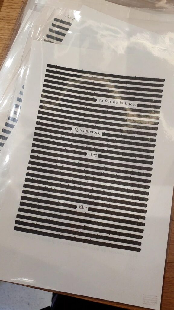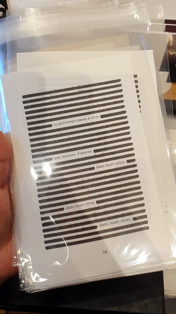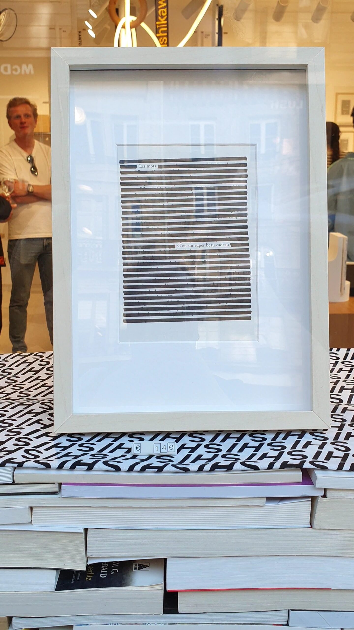 À l’origine de cette expo sensible : Dimitri Rataud, poète et créateur du concept Haïku Marinière. Le principe ? Prendre des pages de romans, rayer la quasi-totalité du texte au feutre noir, et faire émerger, ici ou là, quelques mots. Ensemble, ils forment un poème court, brut, mais toujours évocateur.