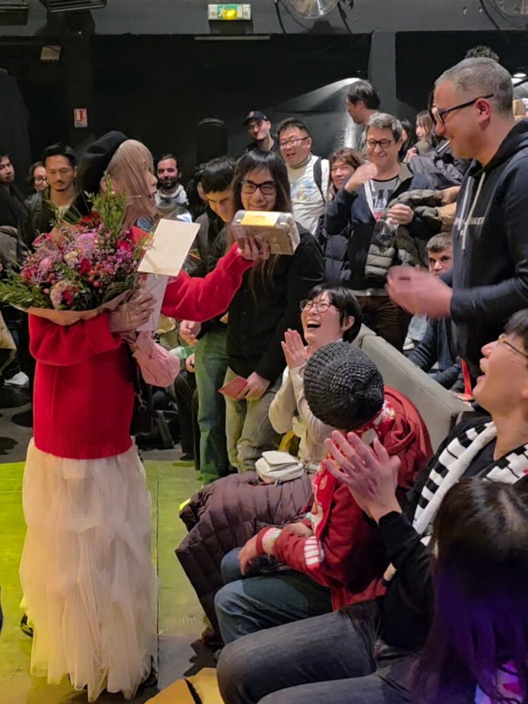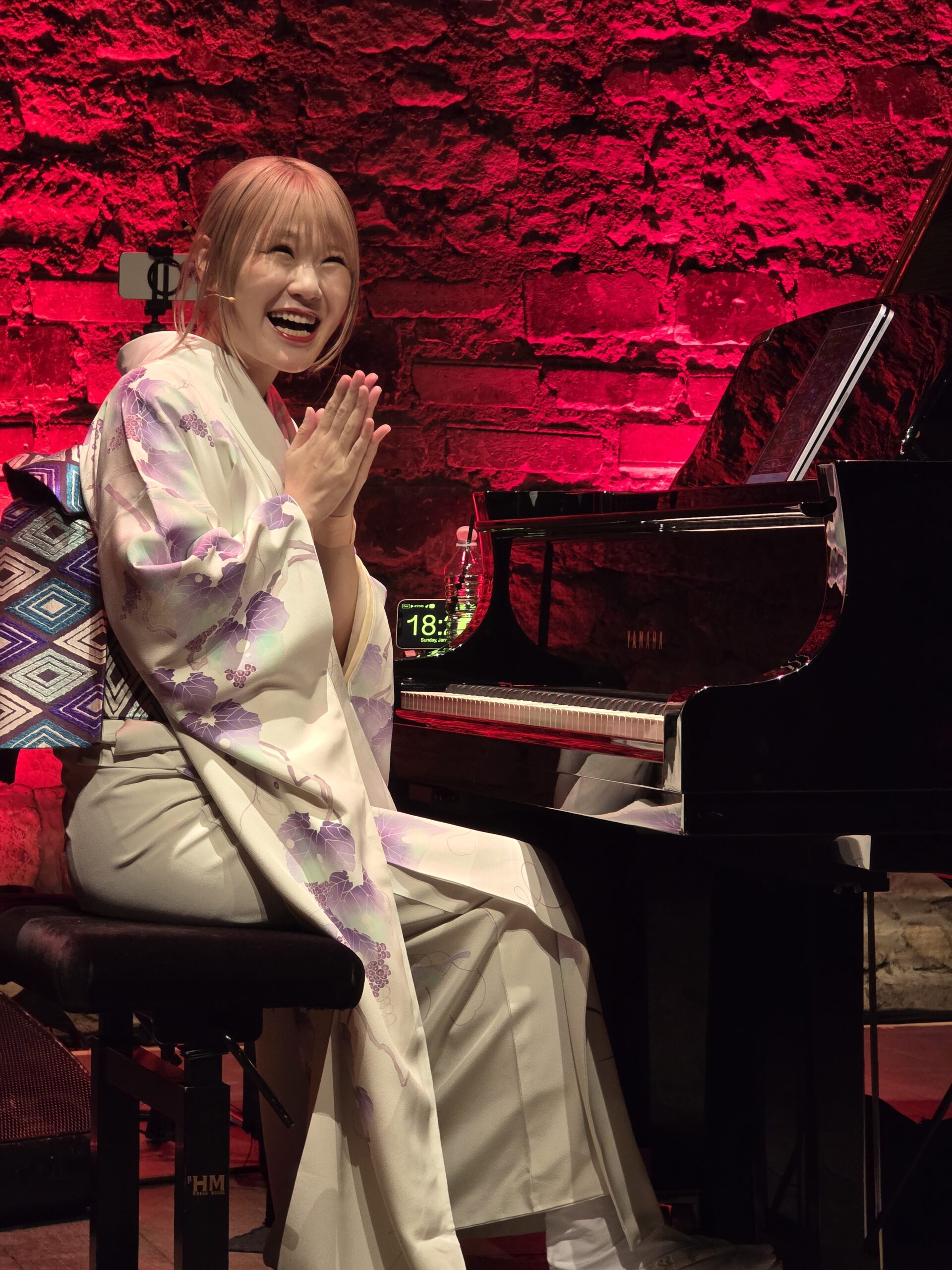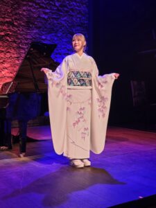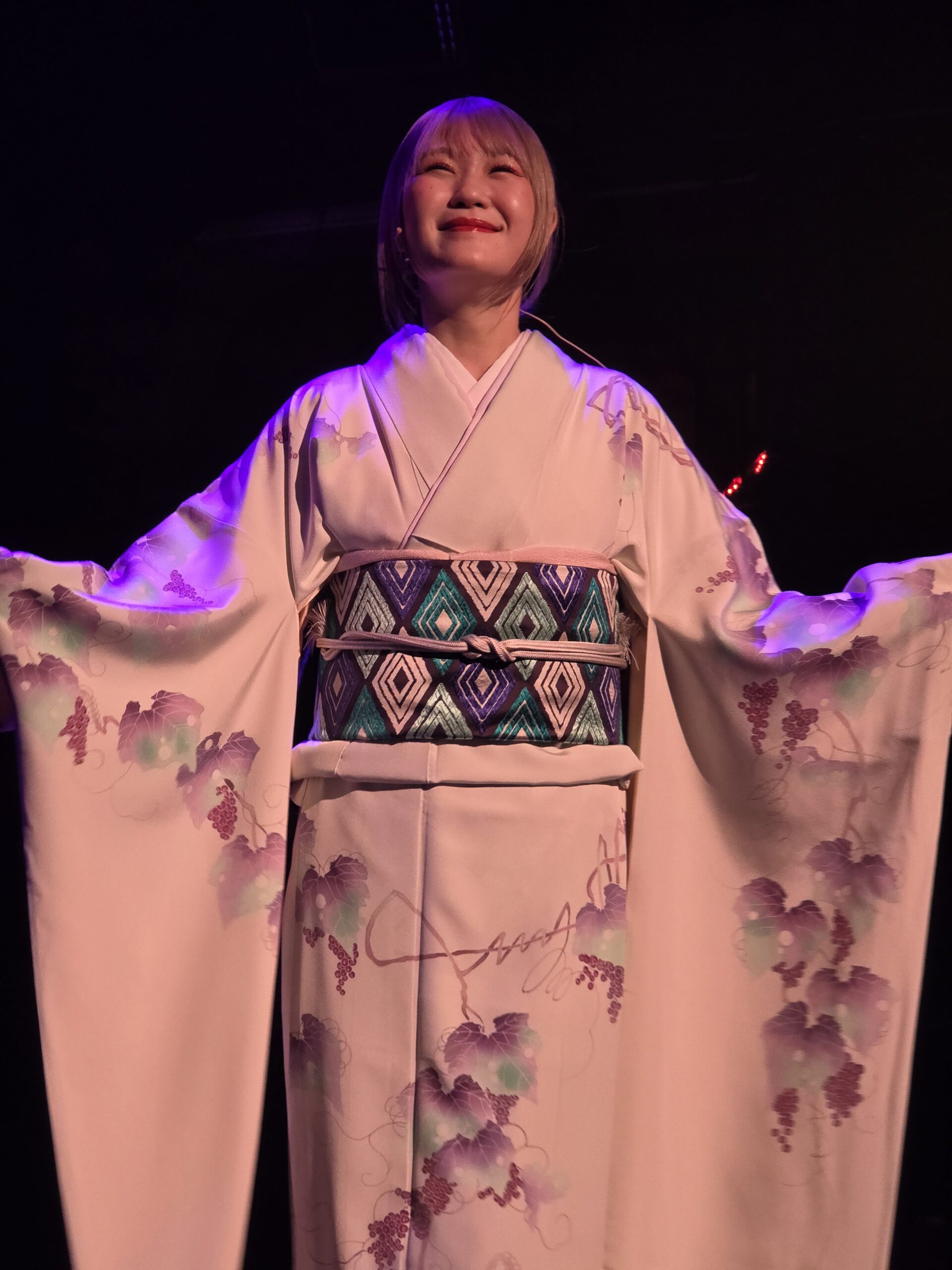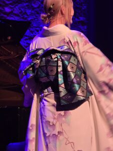 Lorsque HARAMI apparaît, elle prend le temps de s’adresser au public et d’évoquer sa tenue : un kimono confectionné sur mesure à Kyoto, spécialement pour cet événement — son tout premier concert à Paris.