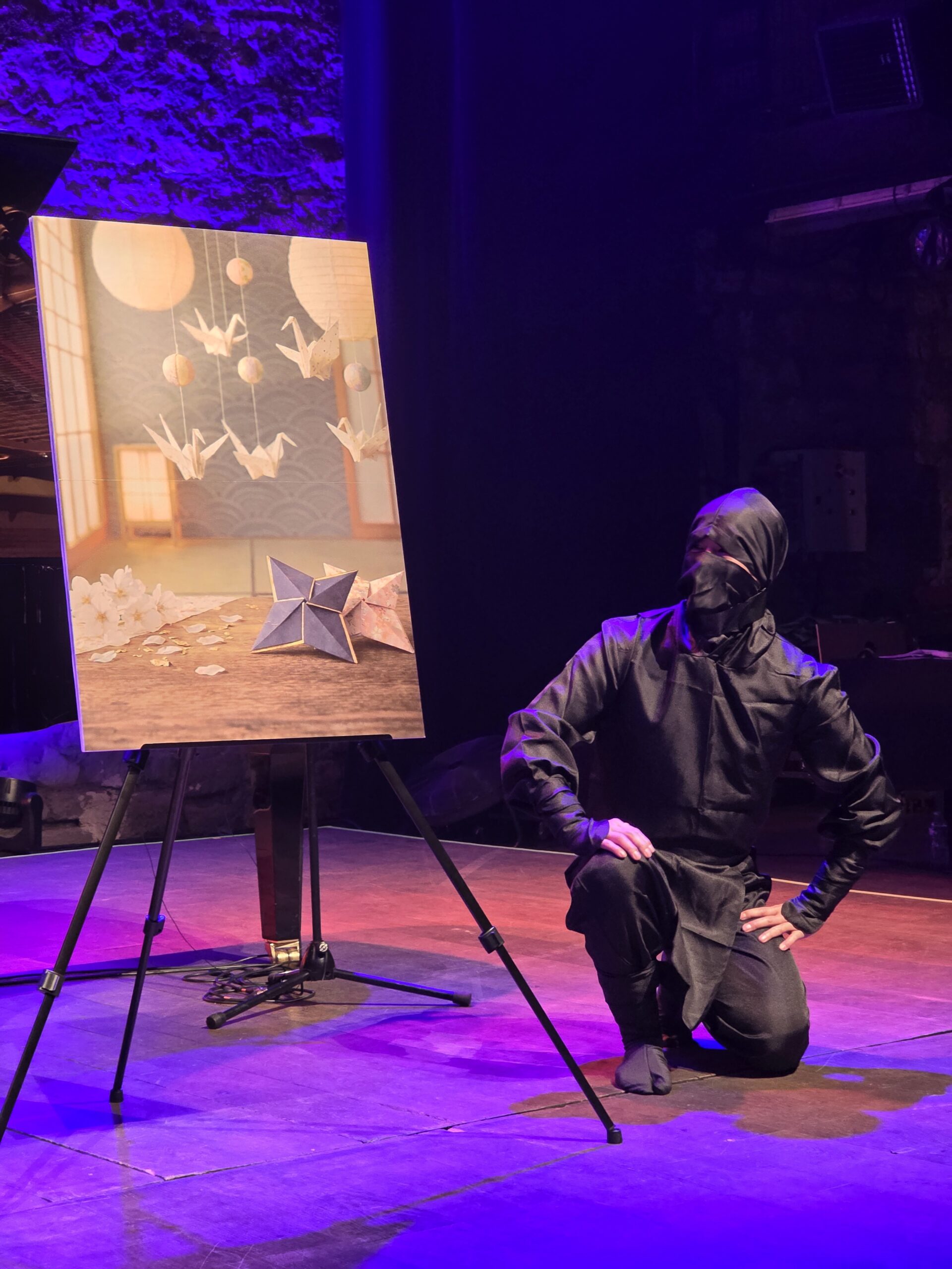 Dès l’entrée dans la salle, chaque spectateur découvre sur son siège un petit tract accompagné d’un shuriken en origami.