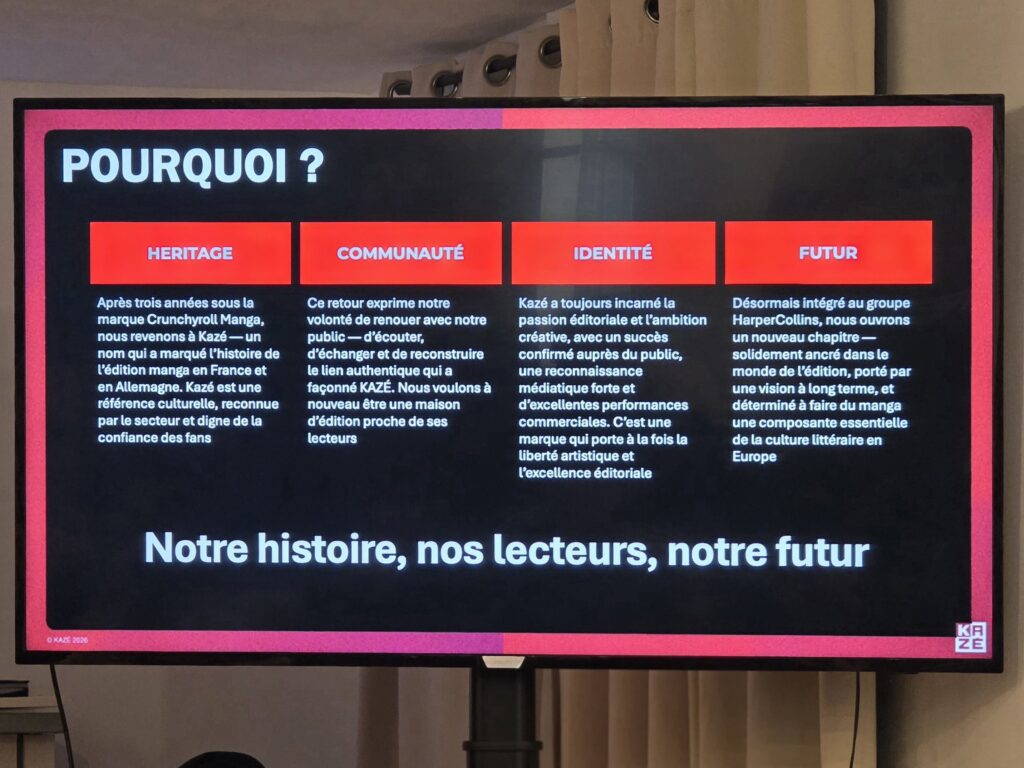 La conférence a débuté par une présentation de la force de frappe du groupe derrière cette initiative. HarperCollins, deuxième éditeur mondial de livres grand public avec un chiffre d’affaires dépassant les deux milliards de dollars, affiche des ambitions claires pour sa branche manga. Sa filiale française, fondée en 2016 après le rachat d’Harlequin, représente déjà un pôle éditorial majeur avec 19 millions d’euros de chiffre d’affaires. C’est dans ce contexte de puissance et de structuration que Pegasus Manga entend redonner à Kazé ses lettres de noblesse.