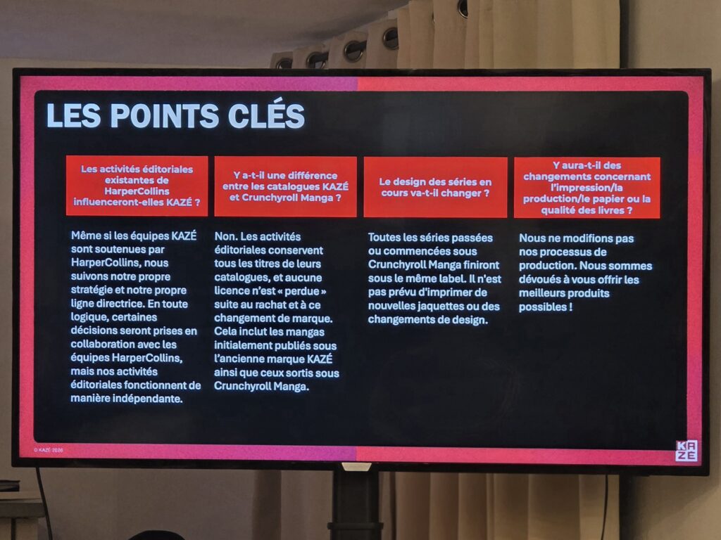 Consciente des interrogations que ce renouveau pourrait susciter, l’équipe de Pegasus Manga a tenu à clarifier plusieurs points essentiels. Il a été fermement affirmé que les activités éditoriales de Kazé fonctionneraient de manière totalement indépendante de celles de Crunchyroll. Les deux catalogues resteront distincts : les séries initiées sous le label Kazé y demeureront, et il en sera de même pour celles publiées par Crunchyroll Manga. Aucune refonte des designs de séries existantes ni réimpression n’est à l’ordre du jour. Enfin, un engagement a été pris sur le maintien d’un haut niveau de qualité de production, que ce soit pour le papier ou les processus de fabrication, avec la promesse de continuer à « offrir les meilleurs produits possibles ».