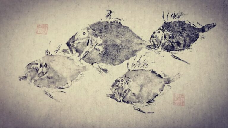 Luc Legendre est un passionné de cet art japonais que l’on appelle gyotaku. C’est son métier de cuisinier qui l’a naturellement guidé vers cette pratique qui honore le souvenir du poisson qui a nourri les Hommes. Un travail de mémoire et une volonté d’utiliser des méthodes durables afin de respecter le produit dans son entièreté. C’est depuis la ville de Rennes, d’où il est originaire, que Luc me confie le fonctionnement de son art qu’il aime transmettre à ses élèves comme à ses clients.
