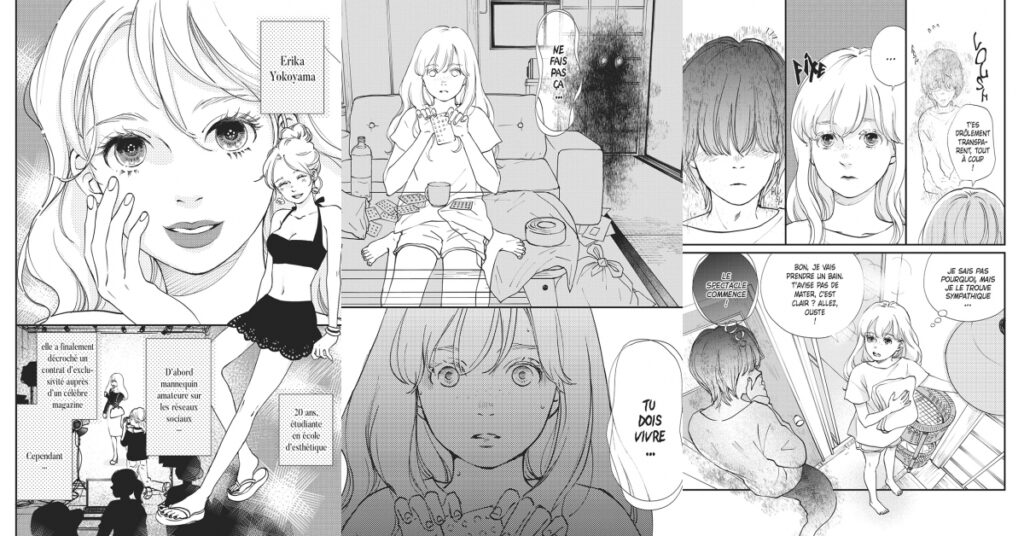 Le spectre de ton désir met en avant Erika, une jeune modèle qui se retrouve au cœur d'un scandale risquant de ruiner sa carrière. Déprimée, la jeune fille reste enfermée chez elle à regarder des films et coucher avec un homme qu'elle n'aime pas. L'apparition dans fantôme dans son salon va bouleverser son quotidien et la forcer à réagir. Le spectre, fan de la jeune fille depuis de longues années, qui va lui être d'un grand soutien. J'ai beaucoup aimé le duo atypique que forment ces deux-là. Malgré leurs différences, leur situation va permettre d'offrir de beaux dialogues et des scènes touchantes, mais également des moments drôles.