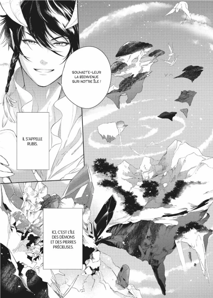 L'univers de ce yaoï est bien développé, avec cette île qui flotte pour se protéger des humains (grâce aux pouvoirs de Rubis), ses habitants morts pendant la guerre et que le roi cherche à sauver, son commerce de pierres précieuses, les familles de griffons, .... J'ai énormément aimé découvrir ces éléments, et j'ai presque eu l'impression que le manga faisait plus d'un tome, tellement il est dense. Et c'est justement là mon seul point négatif : il aurait clairement mérité plus d'un tome ! J'aurais adoré voir cet univers encore plus développé !