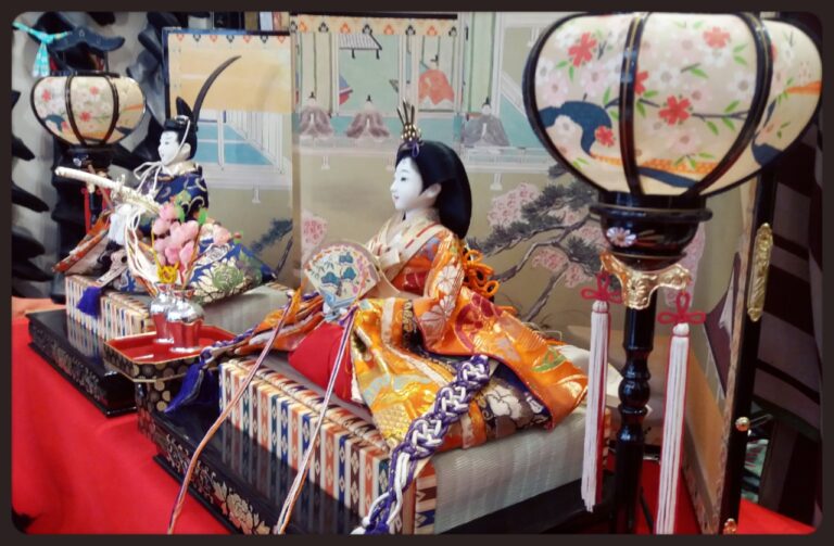 Quelques jours avant, on installe dans la maison de somptueuses poupées sur un autel rouge représentant la cour impériale de l’ère Heian (794-1185). Dans un ordre bien précis, on retrouve tout en haut de l’estrade l’empereur et l’impératrice, en dessous leurs serviteurs, ect… le tout décoré de fleurs de pêchers annonçant l’arrivée du printemps au Japon. On donne à ces fleurs le pouvoir de chasser les mauvais esprits.