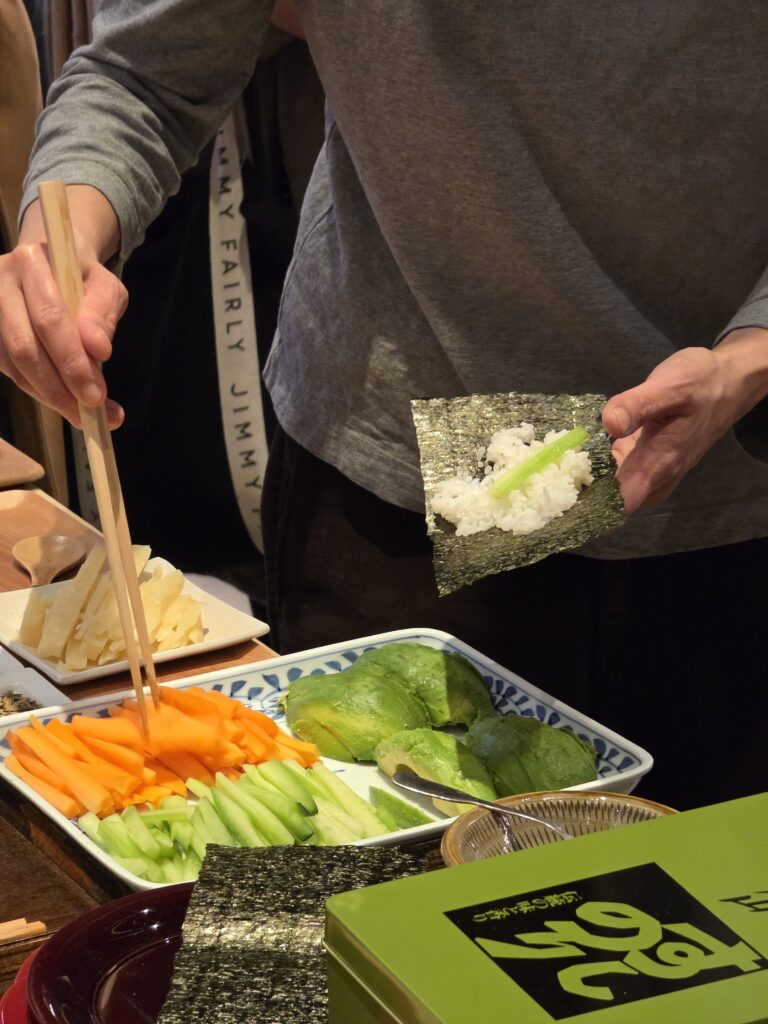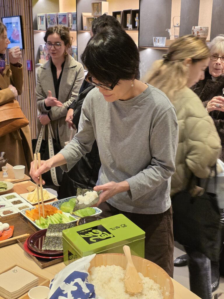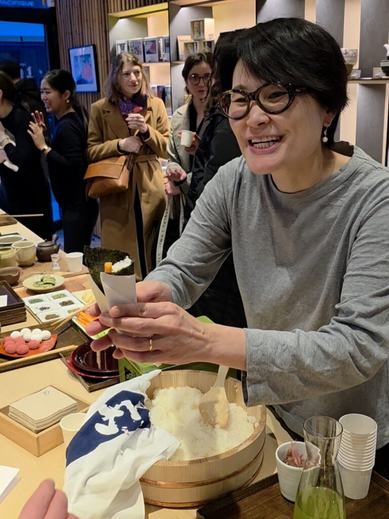 Pour la préparation des ehō-maki, c’est Mme Maki Maruyama, qui tient la boutique Jugetsudo, qui s’est chargée de les réaliser pour les participants. À travers ses gestes précis, elle transmet bien plus qu’une recette : un rapport respectueux aux ingrédients et à la tradition.