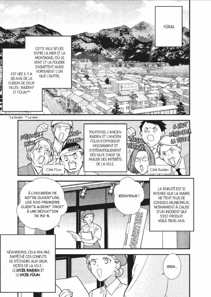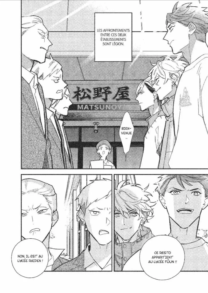 Si je vous parlais d'une ressemblance avec Roméo et Juliette, c'est que les deux jeunes hommes, qui vont rapidement se rapprocher, font partie de deux lycées rivaux (et même de deux parties de la ville, toujours en désaccord). Et il ne s'agit pas d'une simple mésentente, une véritable guerre de territoire se joue entre le lycée Fûun et le lycée Raiden. Les deux jeunes hommes ignorent donc la véritable identité de l'autre lors de leur rencontre, mais cela risque de poser problème lorsque la vérité éclatera Ce premier tome nous promet donc beaucoup de suspense et d'émotions pour la suite.